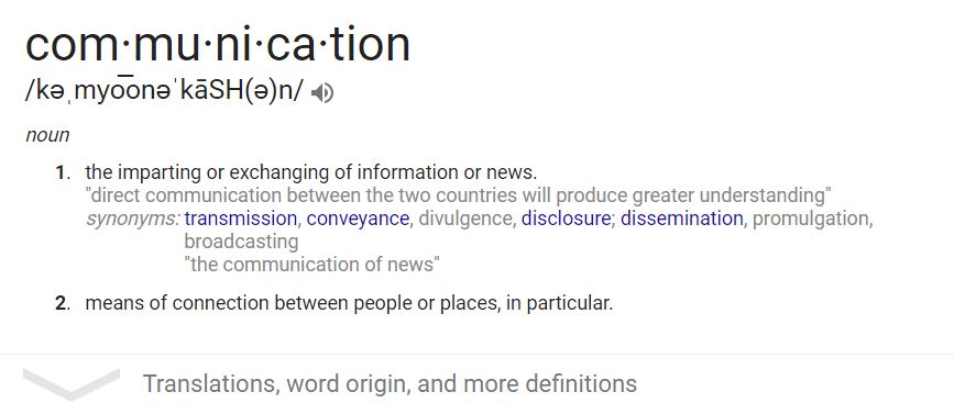 Communication is a process of transferring information from one entity to another. Communication processes are sign-mediated interactions between at least two agents which share a repertoire of signs and semiotic rules. Communication is commonly defined as “the imparting or interchange of thoughts, opinions, or information by speech, writing, or signs”.