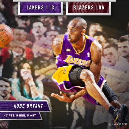 Kobe Bryant explodes for a Rose Garden record 47-points on 14/27 from the field and 18/18 from the line.