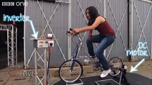 Science Put To The Test: Liz generating electricity while pedaling. Source: http://www.bbc.co.uk/blogs/banggoesthetheory/2009/07